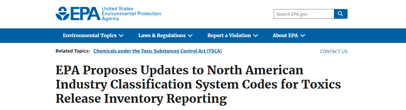 美國環境保護署(EPA)于2022年7月22日提出一項規則,該規則要求將有毒物質排放清單(TRI)報告中的北美行業分類系統(NAICS)代碼更新為 2022年最新版NAICS代碼。此更新不會更改任何TRI報告要求,也不會對需要向TRI報告的工廠范圍產生影響。