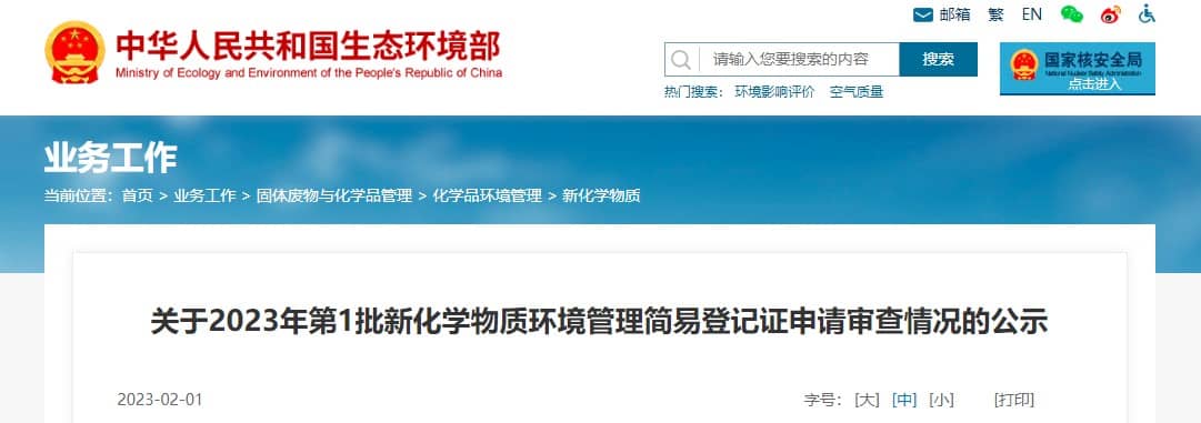 官方發(fā)布 | 生態(tài)環(huán)境部關(guān)于2023年第1批新化學(xué)物質(zhì)環(huán)境管理簡(jiǎn)易登記證申請(qǐng)審查情況的公示