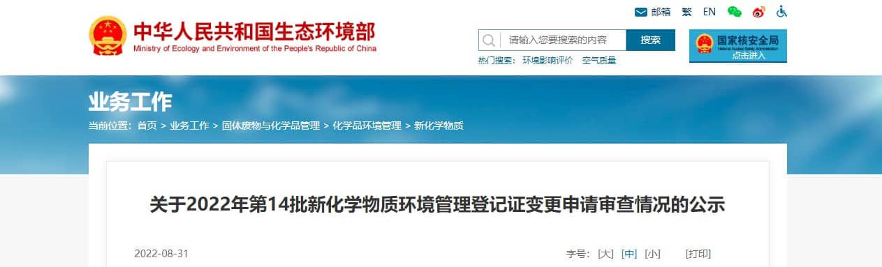 根據《新化學物質環境管理登記辦法》(生態環境部令第12號,以下簡稱《辦法》)、《關于新化學物質環境管理登記有關銜接事項的公告》(生態環境部公告2020年第46號),我部對微麥控生物科技(上海)有限公司等單位的2份新化學物質常規登記證變更申請材料和Panasonic Industry Co., Ltd.等單位的81份簡易登記證變更申請材料進行了審核,符合有關要求,擬批準登記證變更,詳見附表。 根據《辦法》第三十條,現將擬批準的新化學物質環境管理登記證變更申請相關情況予以公示。