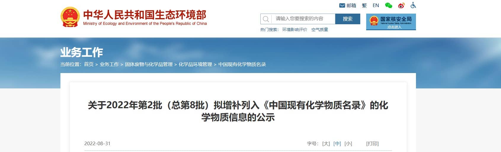 關于2022年第2批(總第8批)擬增補列入《中國現有化學物質名錄》的化學物質信息的公示
