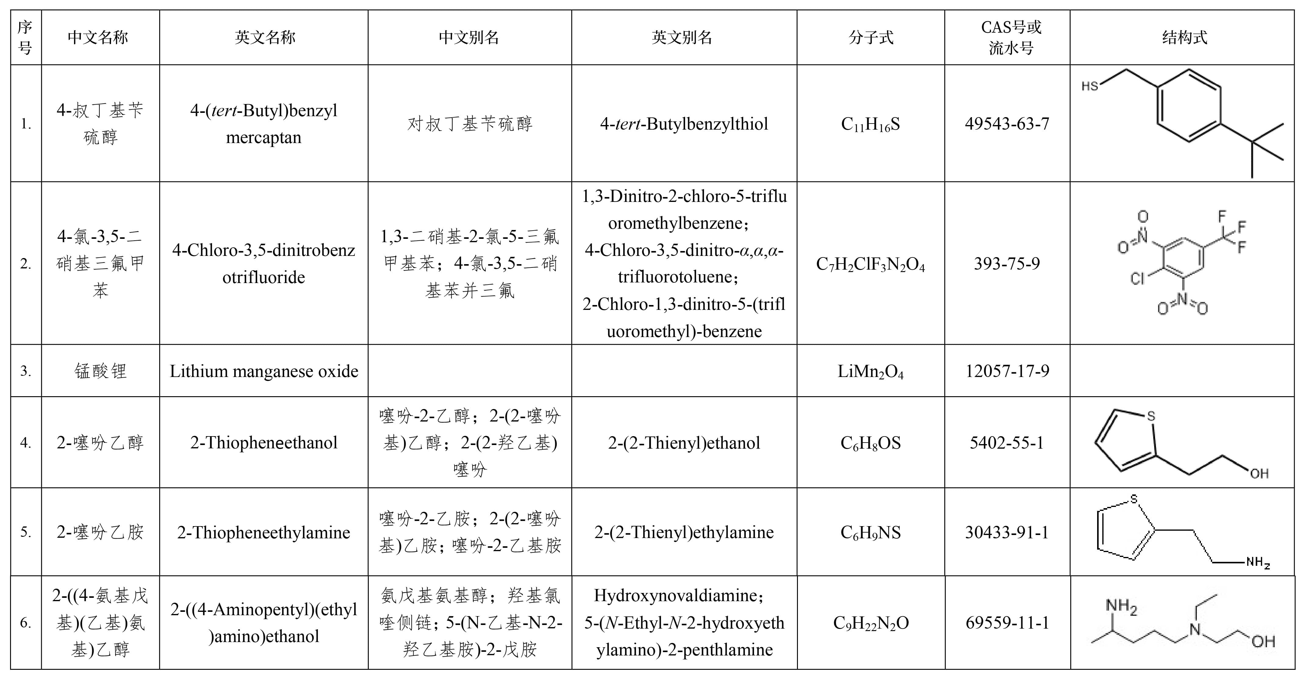 根據《新化學物質環境管理登記辦法》(生態環境部令第12號,以下簡稱《辦法》)和《新化學物質環境管理登記指南》(以下簡稱《指南》)要求,我部對相關單位提交的化學物質增補列入《中國現有化學物質名錄》的申請材料進行了審核,其中6種化學物質的增補申請材料滿足《指南》有關要求和《辦法》第三條的規定,擬增補列入《中國現有化學物質名錄》。