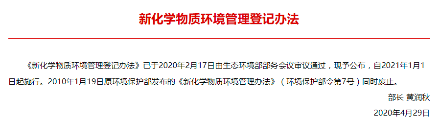 《新化學物質(zhì)環(huán)境管理登記辦法》(生態(tài)環(huán)境部12號令),由生態(tài)環(huán)境部在原環(huán)??偩?7號令和環(huán)境保護部7號令的基礎上,經(jīng)過修訂,并于2020年4月29日正式發(fā)布的行政法規(guī),用于監(jiān)管在中國境內(nèi)的生產(chǎn)、進口、研究和加工使用的新化學物質(zhì)。