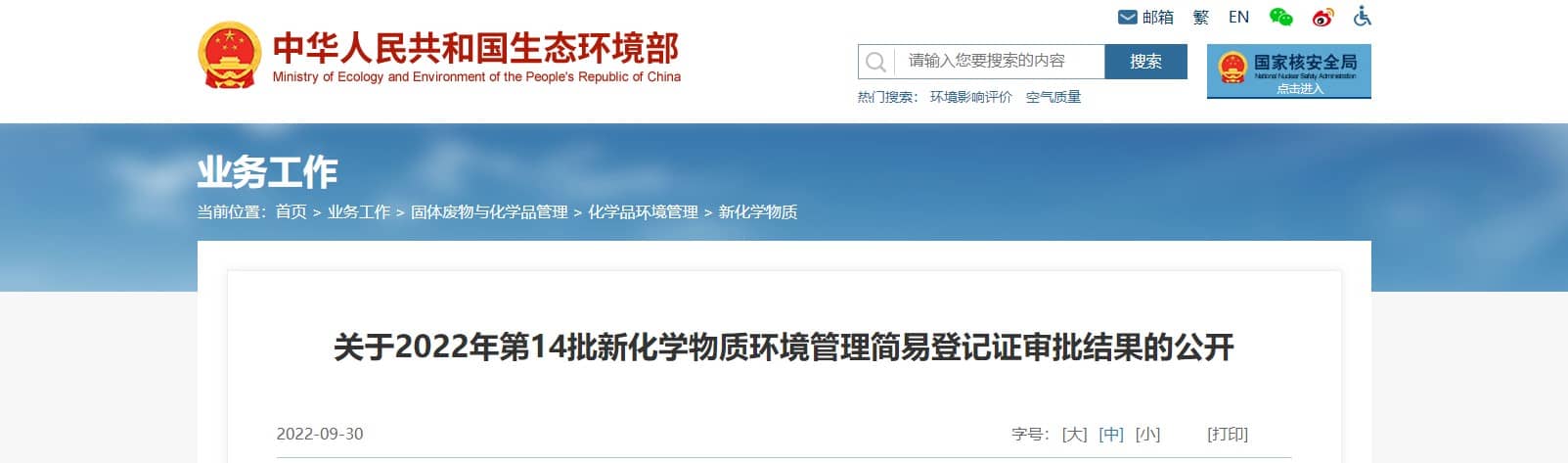 官方發(fā)布 | 關于2022年第14批新化學物質環(huán)境管理簡易登記證審批結果的公開