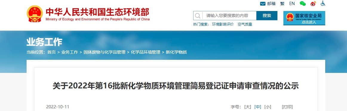 根據《新化學物質環境管理登記辦法》(生態環境部令第12號,以下簡稱《辦法》),我部對捷時雅(上海)商貿有限公司等單位的7份新化學物質簡易登記申請材料進行了審核,符合相關要求,擬批準登記,詳見附表。