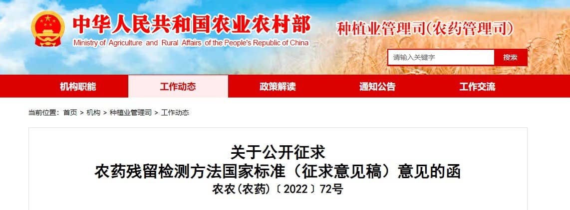 液相色譜-質譜聯用法(征求意見稿)》等5項農藥殘留檢測方法國家標準。現公開征求意見,如有修改意見,請分別填寫征求意見表,于2022年11月21日前反饋國家農藥殘留標準審評委員會秘書處。