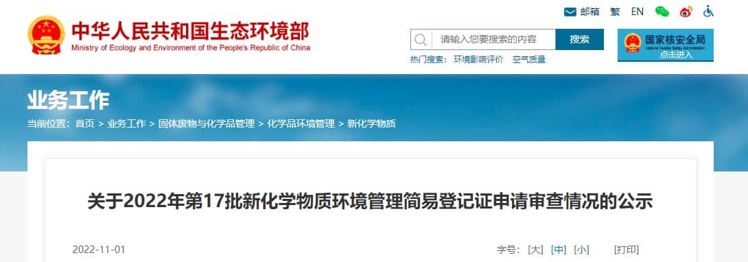 根據(jù)《新化學物質(zhì)環(huán)境管理登記辦法》(生態(tài)環(huán)境部令第12號,以下簡稱《辦法》),我部對廣州龍沙制藥有限公司等單位的8份新化學物質(zhì)簡易登記申請材料進行了審核,符合相關要求,擬批準登記,詳見附表。 根據(jù)《辦法》第二十四條,現(xiàn)將擬批準的新化學物質(zhì)環(huán)境管理簡易登記證申請相關情況予以公示。