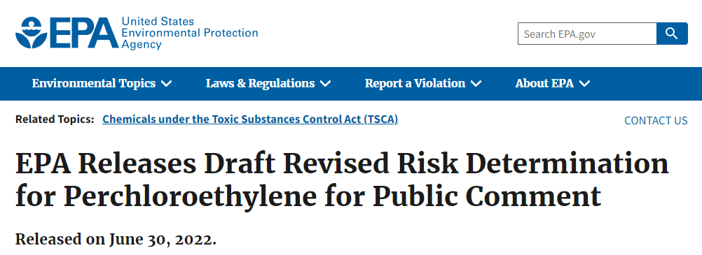 2022年6月30日,據(jù)美國(guó)有毒物質(zhì)控制法案(TSCA)第6(b)條,美國(guó)環(huán)境保護(hù)署(EPA)發(fā)布四氯乙烯(PCE)風(fēng)險(xiǎn)評(píng)估修訂草案,以征詢(xún)公眾意見(jiàn)。修訂后的風(fēng)險(xiǎn)評(píng)估草案指出,四氯乙烯存在使用條件下對(duì)人類(lèi)健康造成不合理傷害風(fēng)險(xiǎn)。EPA的此次修訂將確保在最終確定PCE風(fēng)險(xiǎn)時(shí),更好地與修訂后TSCA中保護(hù)健康和環(huán)境的目標(biāo)保持一致。以在科學(xué)和法律支持下,確保公眾免受化學(xué)品的不合理危害。