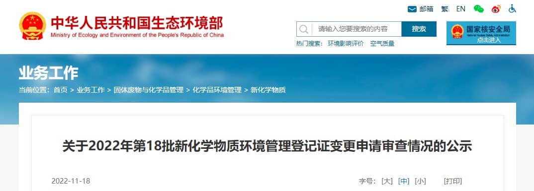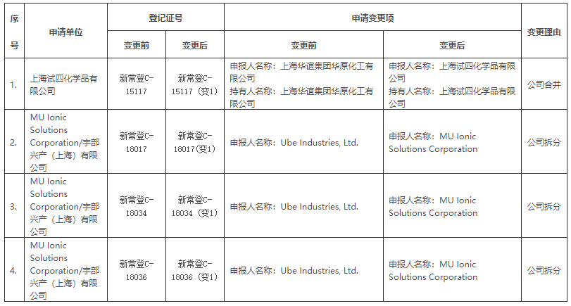 根據《新化學物質環境管理登記辦法》(生態環境部令第12號,以下簡稱《辦法》)、《關于新化學物質環境管理登記有關銜接事項的公告》(生態環境部公告2020年第46號),我部對上海試四化學品有限公司等單位的4份新化學物質常規登記證變更申請材料和偉思磊企業管理(上海)有限公司等單位的35份簡易登記證變更申請材料進行了審核,符合有關要求,擬批準登記證變更,詳見附表。