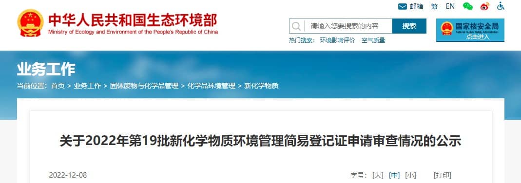 根據《新化學物質環境管理登記辦法》(生態環境部令第12號,以下簡稱《辦法》),我部對浙江辰陽化工有限公司等單位的10份新化學物質簡易登記申請材料進行了審核,符合相關要求,擬批準登記,詳見附表。 根據《辦法》第二十四條,現將擬批準的新化學物質環境管理簡易登記證申請相關情況予以公示。