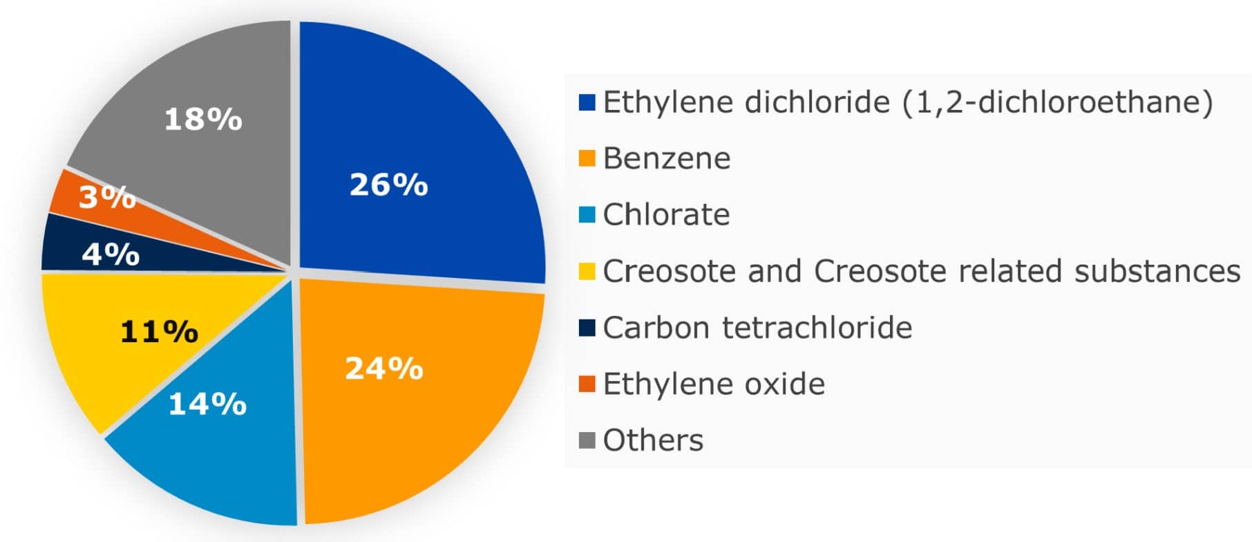非歐盟國家主要進口苯,用于石化行業和分析研究與開發。而二氯化乙烯(1,2-二氯乙烷)一種主要用于生產聚氯乙烯和作為溶劑的工業化學品連續第三年成為出口最多的PIC化學品。