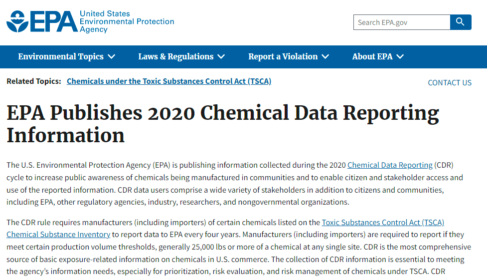 據美國EPA官網消息,美國環境保護署(EPA)于2022年5月12日發布了2020年化學品數據報告(CDR)周期中收集的信息,以提高公眾對流通中的化學品的認識,并使公民和利益相關者能夠獲取和使用報告的信息。CDR數據用戶除了包括公民和社區之外,還包括各種各樣的利益相關者,包括EPA,其他監管機構,行業,研究人員和非政府組織。